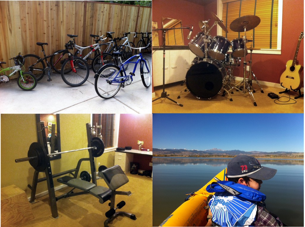 We have all the stuff we need. Too much stuff. Five working computer systems sharing a high-speed wireless network system stocked with movies and music. A video projector in the basement with an 11-foot screen for movie nights. A stereo system that can reproduce the richest and most detailed music you’ve ever heard, and five other systems which also play music. A complete Ludwig classic 1994 maple drum kit. Two guitars. Microphones and mixers. A frickin’ five-foot-long Didgeridoo bought directly from its Aboriginal maker in Australia, who also taught me how to play it. A set of carpentry tools complete enough to build an entire house from scratch. An enviable set of educational toys for the little boy.  Six bicycles*. A Sevylor inflatable kayak. Great camping gear. Workout gear. Snowboarding gear. Too much!