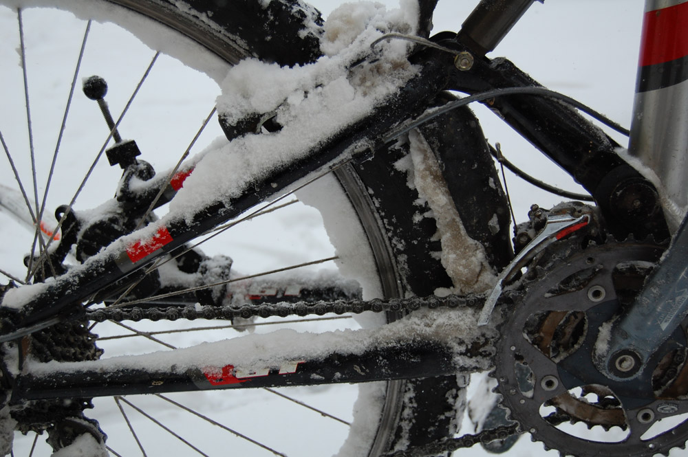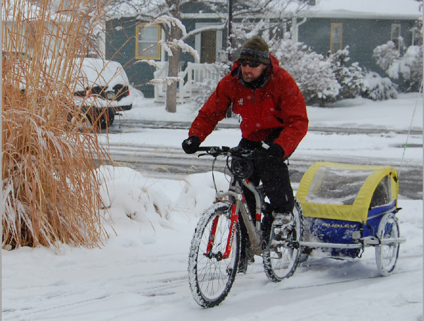 During one of these storms, I happened to need groceries, so I threw on some snow gear and hooked the bike trailer up to my burly old full-suspension mountain bike. As the garage door rolled up, I was greeted with an apocalyptic blizzard: strong winds, huge flakes everywhere, and a deep crust of snow and ice on all surfaces. It was going to be an interesting ride.