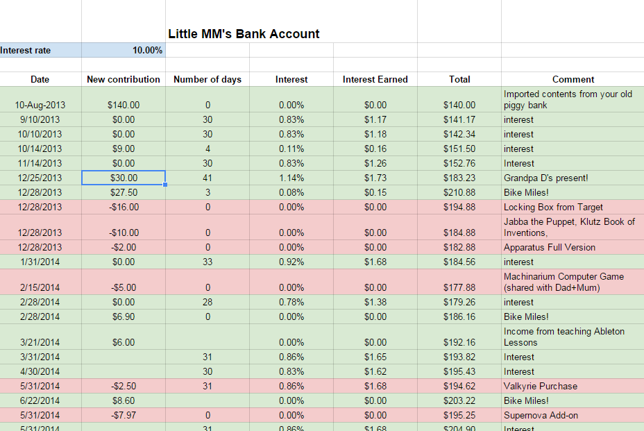 bankaccountThis is where things get a bit unconventional. Instead of a physical piggy bank, my boy prefers to keep his money in the Bank of Mr. Money Mustache, a spreadsheet that contains every transaction he makes with money. To make a deposit, he just hands me some cash. To withdraw, he asks me for cash or has me buy something for him online.