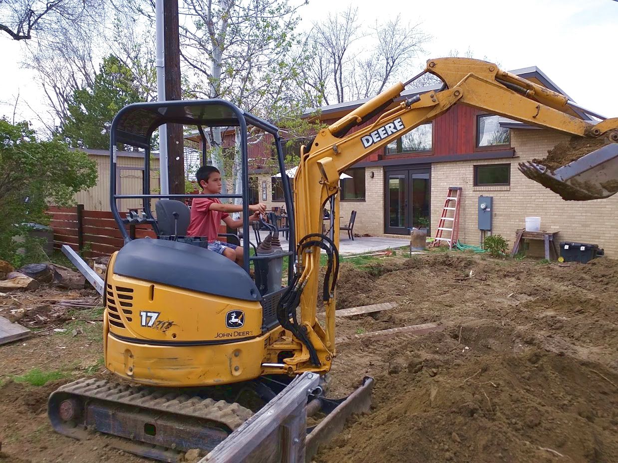 After digging the hole successfully I taught my son to use the machine and he was able to load the 6000 pound dirt pile nicely into an open-top trailer for transfer to our front garden.