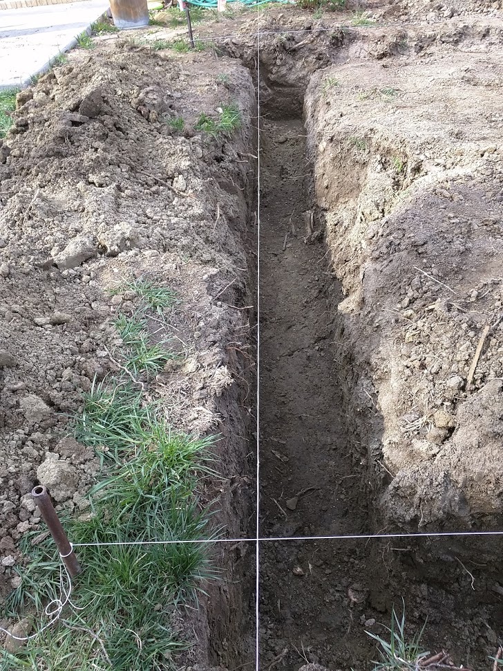 After the machine digging, I set the strings back up and went back through with a shovel to fine tune the depth and positioning of the trench. My son made a nifty timelapse video of the process and even wrote some music for it – watch it on YouTube if you like.