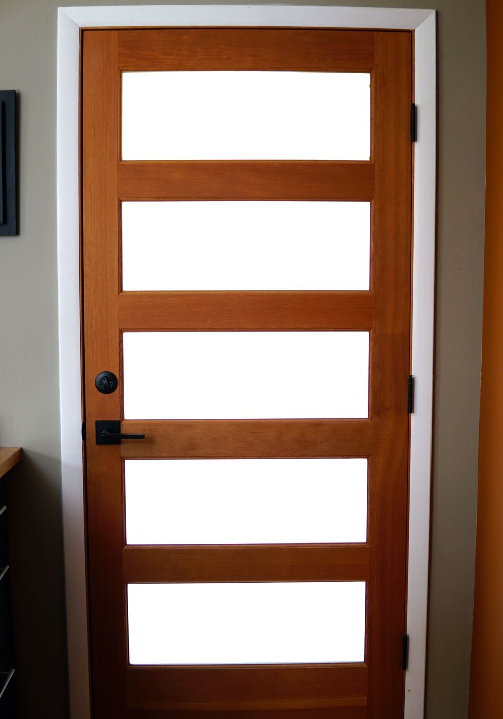 That sweet door should have signed a contract with you to ensure it would be paired with trim/casing of the same species, unpainted, with a stain/finish that does not differ from that of the door, at least or exceeding 3.5 inches in width, with at least three clean profile lines. But then again maybe that would make carpentry less fun ;)