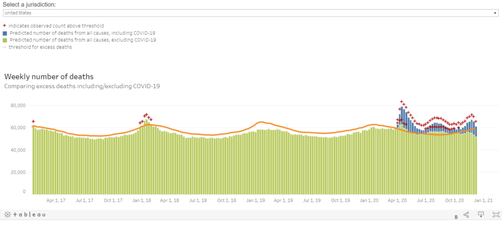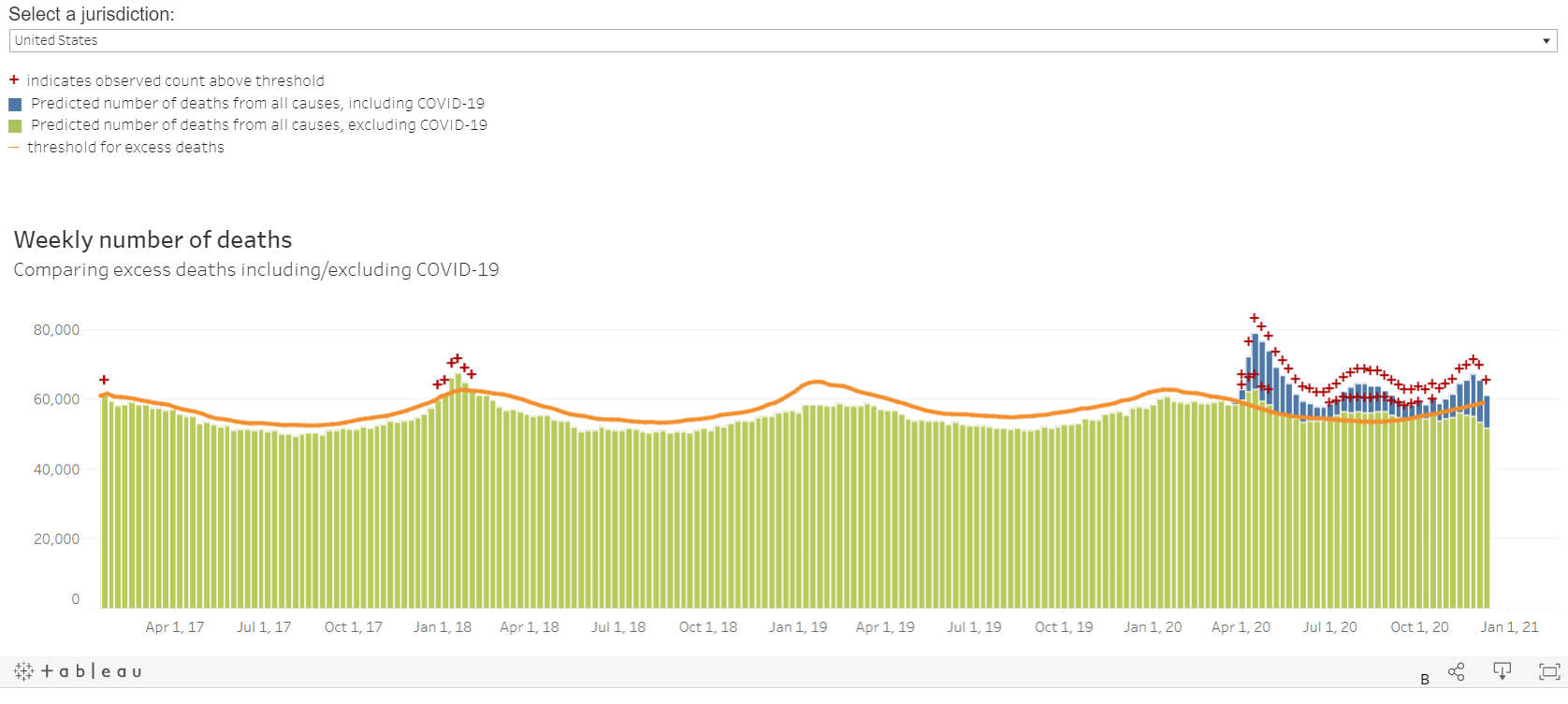 From the US CDC: The ongoing forest fire of COVID-related deaths (blue) versus our deaths from other causes (green).