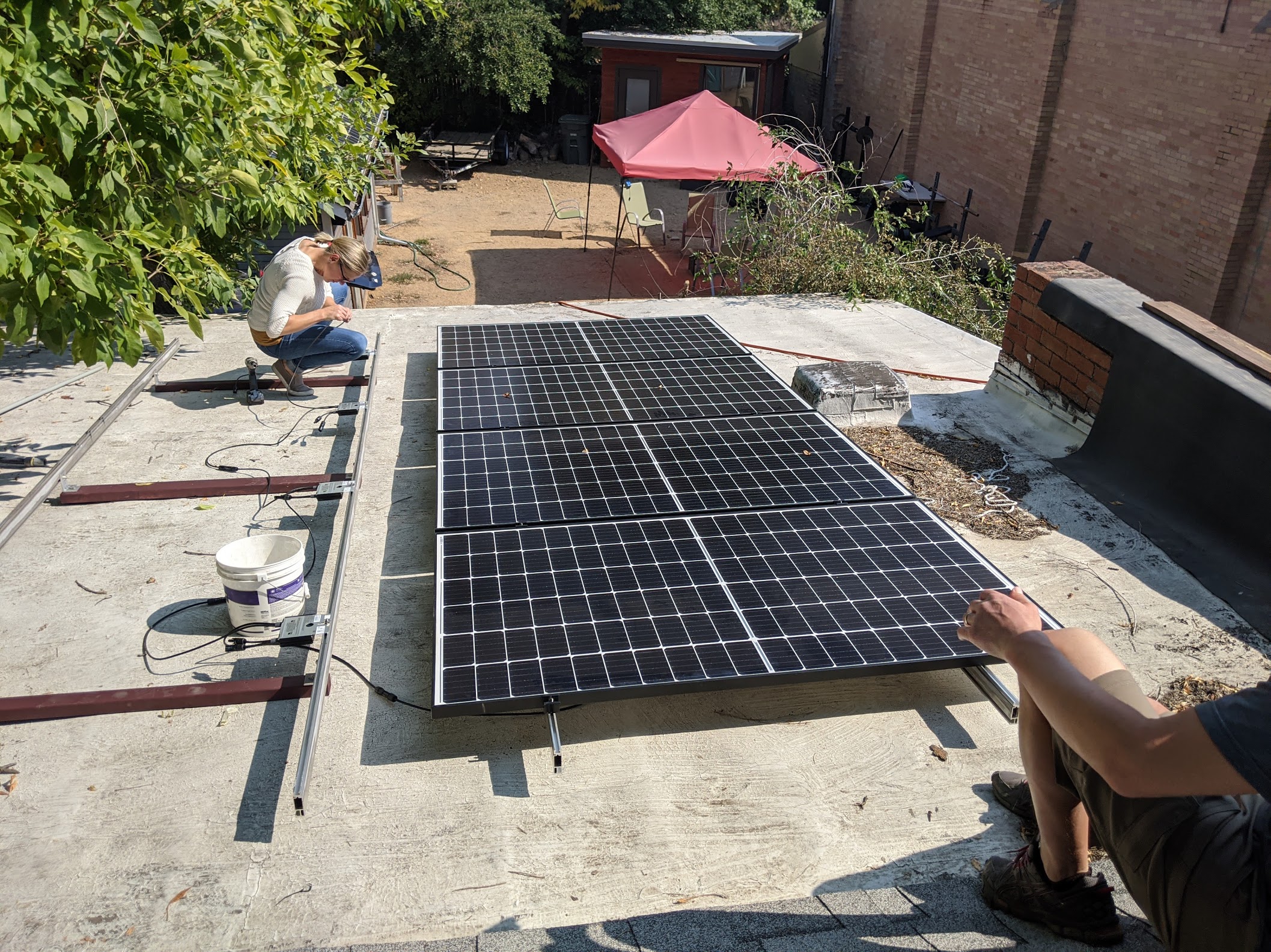 Coworking members help me install another eight panels of solar panel onto more of the roof of the HQ building.